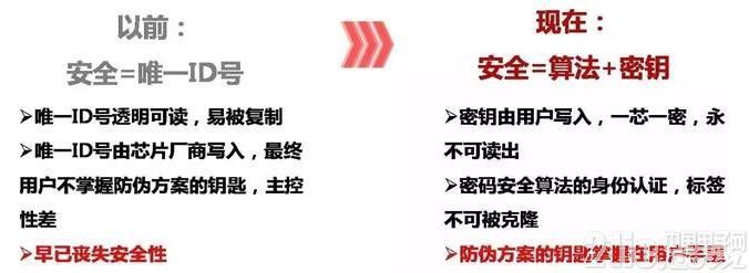 左邊是傳統的RFID標簽芯片結構圖,包括一個UID+安全口令+用戶數據,存在安全漏洞。