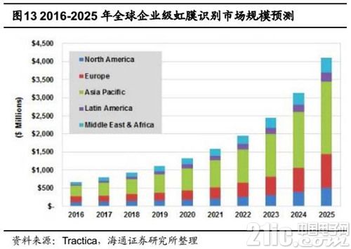 從終端市場來看,據數據顯示,2016 年全球企業級虹膜識別終端出貨量1070萬臺,預計到2025年出貨量將達到6160萬臺,復合年均增速為19.1%,對應市場規模將從2016年的6.77億美元增長至2025年的41億美元,復合年均增速19.7%。其中,2020年市場規模約為13.5億美元。