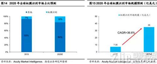 根據美國智庫Acuity Market Intelligence的報告顯示,虹膜識別在手機、平板電腦等消費級終端市場規模將增長的更快。預計 2020年全球生物識別市場將達到 218.7億美元,其中虹膜識別技術占全球生物特征識別的市場份額,將從2015年的7%提升至2020年的16%,2020年的總產值將達到35億美元,對應復合年均增速為36.6%。