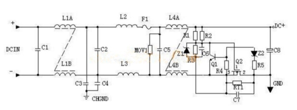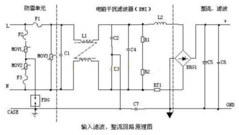 輸入分析:圖中C1、L1、C2、C3組成的濾波電路是對輸入電源的電磁噪聲和雜波信號進行抑制;防止對電源干擾和對電網(wǎng)干擾;RT1的作用是防止浪涌電流;保護后級電路正常工作。