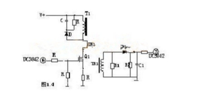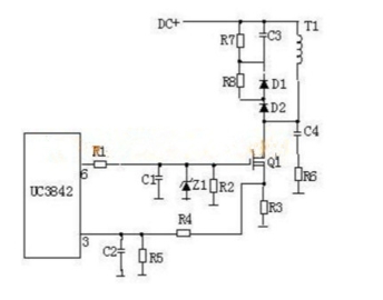 圖中R4、C3、R5、R6、C4、D1、D2組成緩沖器再和開關(guān)MOS管并接;使開關(guān)管電壓應力、EMI減少;這些元件組合一起,很好地吸收尖峰電壓和電流。從R3測得的電流峰值信號參與當前工作周波的占空比控制,因此當前工作周波的電流限制;當R5上的電壓達到1V時,UC3842停止工作,開關(guān)管Q1立即關(guān)斷。R1和Q1中的結(jié)電容CGS、CGD一起組成RC網(wǎng)絡(luò),電容的充放電直接影響著開關(guān)管的開關(guān)速度。R1過小,易引起振蕩,電磁干擾也會很大;R1過大,會降低開關(guān)管的開關(guān)速度。