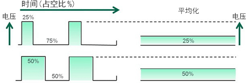 上圖是利用代表性的控制方式PWM(Pulse Width Modulation:脈沖寬度調制)方式加以降壓的原理。PWM是指讓周期(頻率)保持恒定,調整ON和OFF的時間比,也就是占空比來進行控制的方法,能運用在開關電源、電源模塊等多種應用上。采用PWM時,經由開關將DC電壓轉換成達到必要占空比的AC后,接著再進行整流回到DC,以取得想要的DC電壓。例如經由開關將100VDC轉換成周期25%ON、剩下OFF的25:75的AC。接著,整流-平滑該AC,也即將其均勻化后轉換成DC,電壓就會轉換成相當于25%的25VDC。