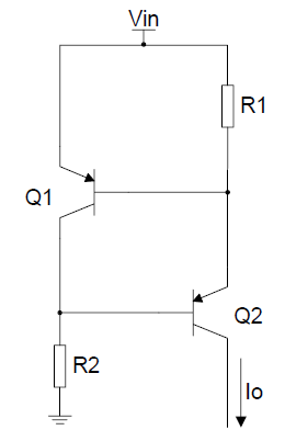 電路1:由兩個同型號的三極管,根據三極管Vbe電壓相對穩定,以及三極管的基極電流相對集電極電流較小的特點,組成一個電流相對恒定的恒流源,電流Io=Vbe/R1。這個恒流源沒有用到特殊器件,兩個三極管和兩個電阻組成,成本低,電流Io可調。缺點是Vbe的大小會隨電流及溫度的變化而變化,電流大Vbe大,溫度低Vbe大,所以不適合用在精度要求高的地方。