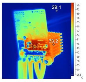 在圖中您可看到頂側(cè)冷卻的有效性,其中PCB上觀察到的最大溫度(功率塊底殼之下)與散熱器溫度之間的差異小于11°C。熱量傳導(dǎo)良好,并通過模塊電源的頂部冷卻金屬焊盤分配到頂側(cè)散熱器。頂側(cè)和底側(cè)FET之間的熱量共享,在單相或三相逆變器中,頂側(cè)和底側(cè)MOSFET的損耗可能不同。這些損耗通常取決于脈寬調(diào)制拓?fù)涞念愋秃凸ぷ髡伎毡?,不同的損耗導(dǎo)致頂側(cè)和底側(cè)MOSFET的加熱不同。