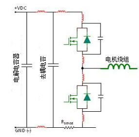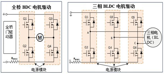 為在兩個(gè)方向上驅(qū)動(dòng)BDC電機(jī),您需要使用兩個(gè)半橋(四個(gè)金屬氧化物半導(dǎo)體場(chǎng)效應(yīng)晶體管(MOSFET))組成一個(gè)全橋。要驅(qū)動(dòng)三相BLDC電機(jī),需要使用三個(gè)半橋(六個(gè)MOSFET)組成一個(gè)三相逆變器。 使用TI的采用堆疊管芯架構(gòu)的CSD88584Q5DC 和CSD88599Q5DC模塊電源(小型無引線(SON),5mm×6mm封裝),您可通過兩個(gè)模塊電源和只帶三個(gè)模塊電源的三相BLDC電機(jī)在兩個(gè)方向驅(qū)動(dòng)電機(jī),每個(gè)模塊電源連接兩個(gè)MOSFET(高側(cè)和低側(cè)MOSFET),組成一個(gè)半橋。如下圖所示。