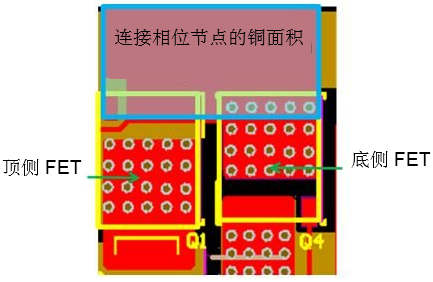 上圖所示為將頂部和底部分立MOSFET并排連接時(shí)的銅軌道,這是可將電機(jī)繞組連輕松連接到PCB的常見布局之一。連接相位節(jié)點(diǎn)的銅面積的長度為寬度的兩倍(軌道寬度取決于電流,軌道寬度通常受電路板的外形尺寸限制)?;蛘吣梢陨舷屡帕许攤?cè)和底側(cè)分立MOSFET,保持在相位節(jié)點(diǎn)之間。但是由于需要提供將電機(jī)繞組連接到相位節(jié)點(diǎn),您可能無法減少軌道長度,并且這種布置可能不適合所有應(yīng)用。
